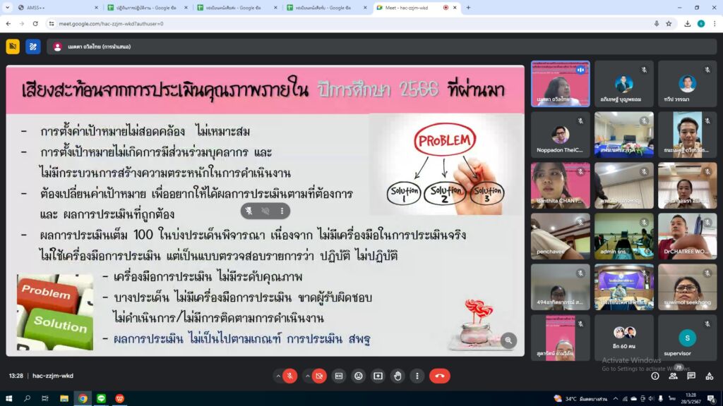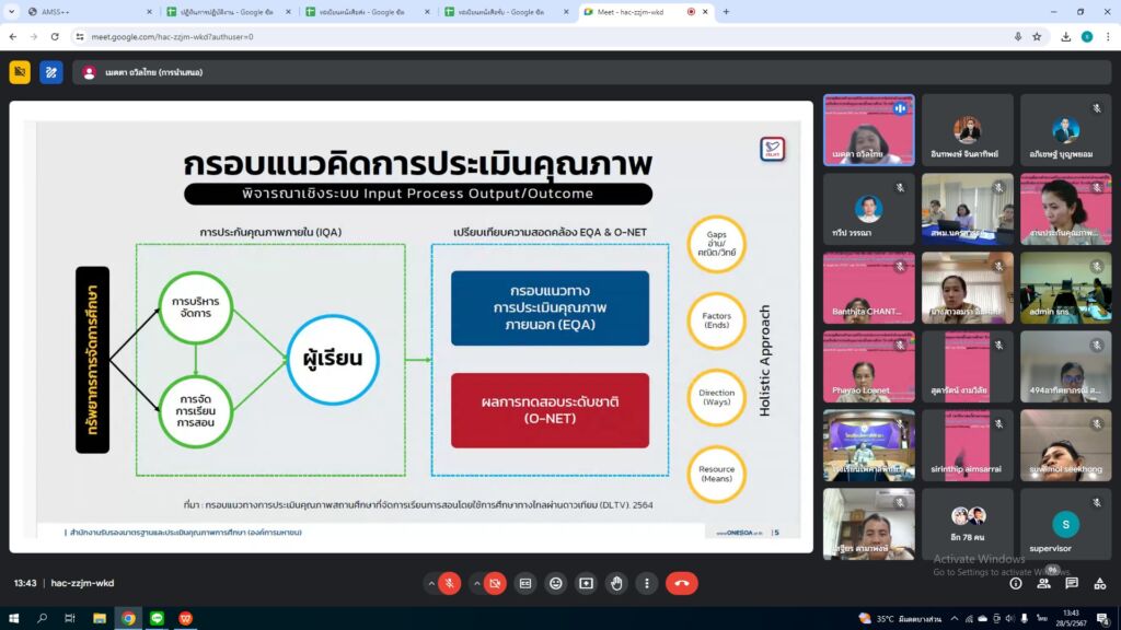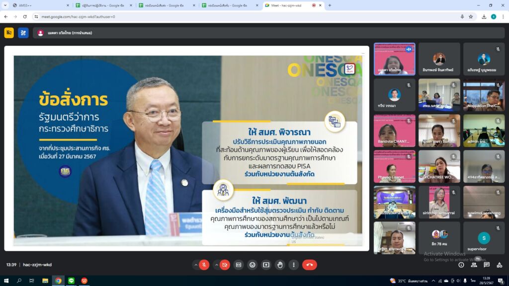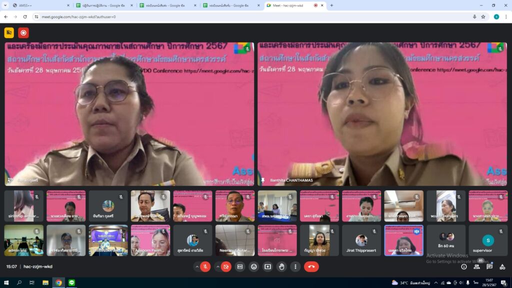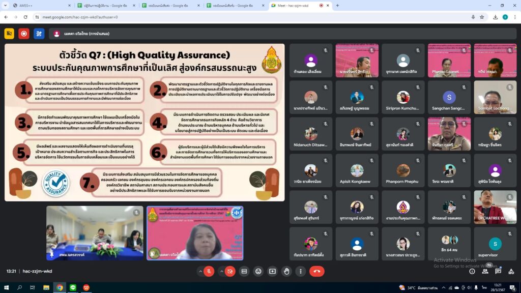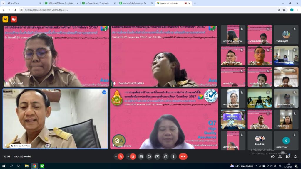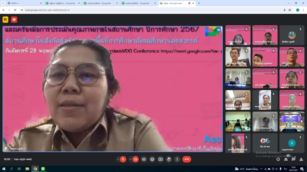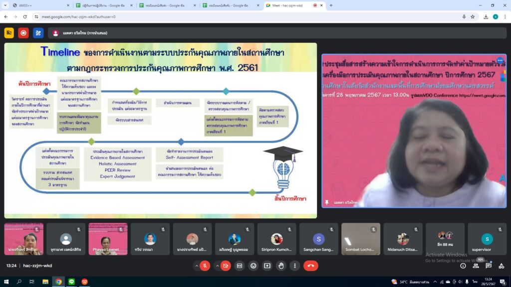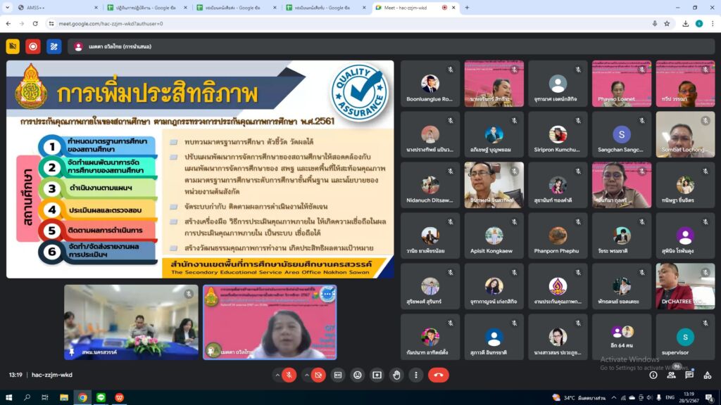 วันอังคารที่ 28 พฤษภาคม พ.ศ. 2567 เวลา 13.00 น. นายสมบัติ ล้อจงเฮง รองผู้อำนวยการสำนักงานเขตพื้นที่การศึกษามัธยมศึกษานครสวรรค์ เป็นประธานการประชุมปฏิบัติการสื่อสารสร้างความเข้าใจ เรื่องการจัดทำค่าเป้าหมายตัวชี้วัดและเครื่องมือการประเมินคุณภาพภายในสถานศึกษา ปีการศึกษา 2567 รูปแบบ VDO Conference โปรแกรม Google Meet โดยวัตถุประสงค์การประชุม เพื่อให้สถานศึกษาในสังกัดจัดทำค่าเป้าหมาย ตัวชี้วัดและเครื่องมือการประเมินคุณภาพภายในสถานศึกษา ปีการศึกษา 2567 ได้อย่างถูกต้อง เหมาะสม และเป็นไปได้ และสร้างความเข้มแข็งในการดำเนินงานพัฒนาระบบประกันคุณภาพภายในสถานศึกษาตามกฎกระทรวงการประกันคุณภาพการศึกษา พ.ศ. 2561 ณ ห้องประชุมลูกนเรศวร สำนักงานเขตพื้นที่การศึกษามัธยมศึกษานครสวรรค์