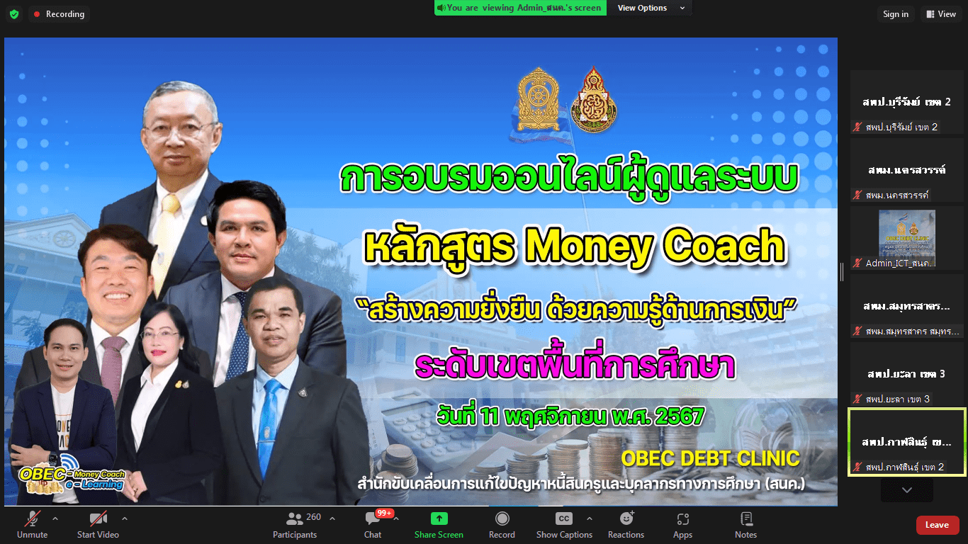 วันจันทร์ที่ 11 พฤศจิกายน พ.ศ. 2567 เวลา 9.00 น. นายประทาน หาดยาว ผู้อำนวยการสำนักงานเขตพื้นที่การศึกษามัธยมศึกษานครสวรรค์ นายสมบัติ ล้อจงเฮง รองผู้อำนวยการสำนักงานเขตพื้นที่การศึกษามัธยมศึกษานครสวรรค์ นางมัณฑนา รอทอง ผู้อำนวยการกลุ่มอำนวยการ และ ว่าที่ร้อยตรีสุรเศรษฐ์ ศรชัย นักวิชาการคอมพิวเตอร์ เข้าร่วมการประชุมอบรมออนไลน์ผู้ดูแลระบบ Money Coach “สร้างความยั่งยืน ด้วยความรู้ด้านการเงิน” ระดับเขตพื้นที่การศึกษา OBEC DEBT CLINIC สำนักขับเคลื่อนการแก้ไขปัญหาหนี้สินครูและบุคลากรทางการศึกษา (สคน.) ผ่านระบบออนไลน์ Zoom Call โดยมี นางเกศทิพย์ ศุภวานิช รองเลขาธิการคณะกรรมการการศึกษาขั้นพื้นฐาน เป็นประธานการประชุม ณ ห้องประชุมสารสนเทศ สำนักงานเขตพื้นที่การศึกษามัธยมศึกษานครสวรรค์