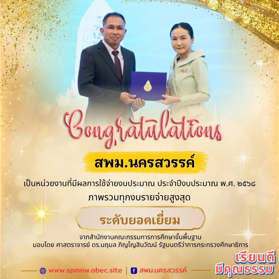 ขอแสดงความยินดีกับ สำนักงานเขตพื้นที่การศึกษามัธยมศึกษานครสวรรค์ เป็นหน่วยงานที่มีผลการใช้จ่ายงบประมาณ ประจำปีงบประมาณ พ.ศ. ๒๕๖๘ ภาพรวมทุกงบรายจ่ายสูงสุด ระดับยอดเยี่ยม จากสำนักงานคณะกรรมการการศึกษาขั้นพื้นฐาน มอบโดย ศาสตราจารย์ ดร.นฤมล ภิญโญสินวัฒน์ รัฐมนตรีว่าการกระทรวงศึกษาธิการ 25 ตุลาคม 2025suraset sornchaiข่าว สพม.นครสวรรค์