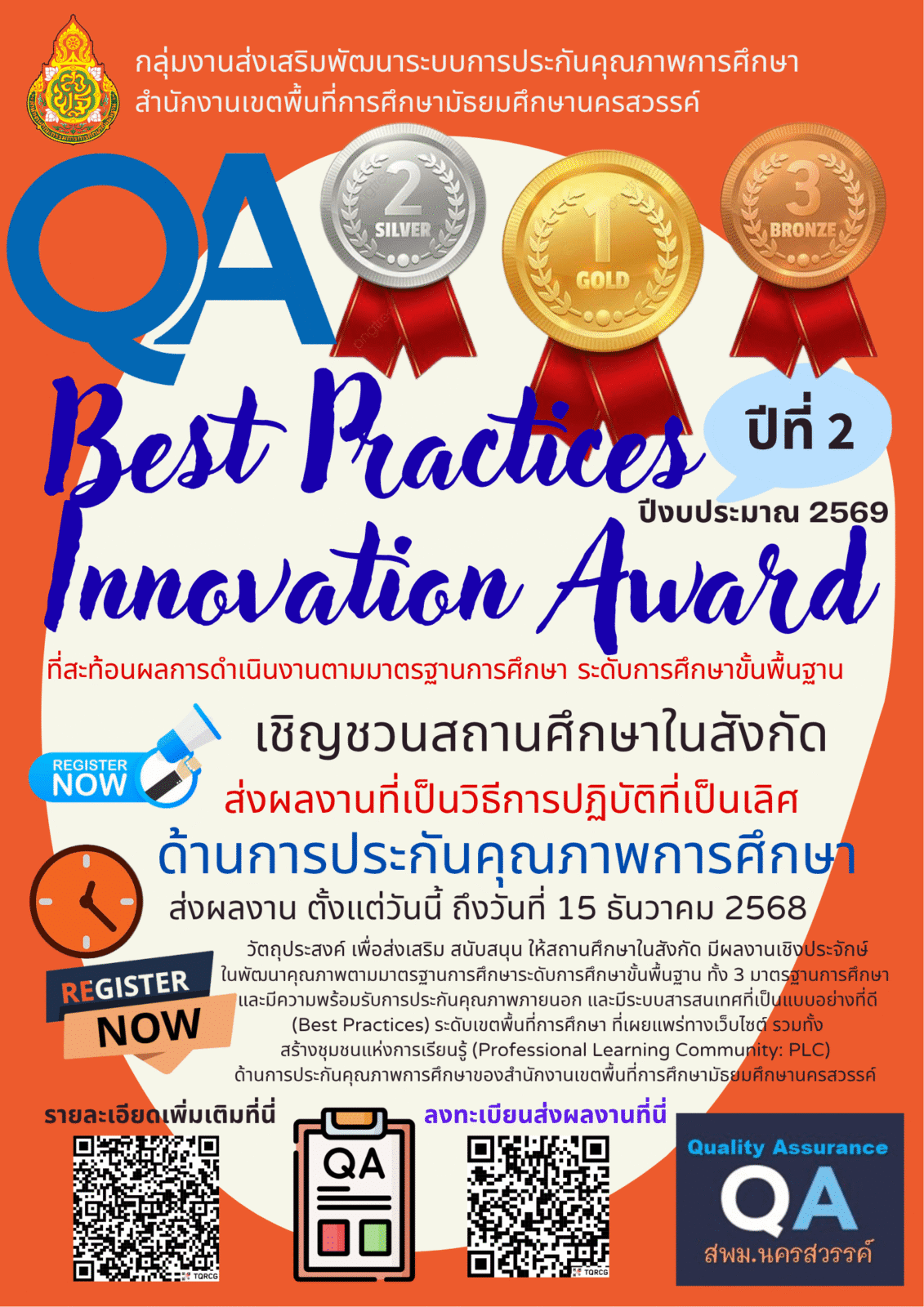 สำนักงานเขตพื้นที่การศึกษามัธยมศึกษานครสวรรค์ ประชาสัมพันธ์ สถานศึกษาในสังกัด สนใจส่งผลงานเข้าร่วมประกวดผลการดำเนินงานที่เป็นวิธีการปฏิบัติที่เป็นเลิศ (Best Practiceห) หรือ นวัตกรรมการศึกษา (Innovation) ด้านการประกันคุณภาพการศึกษา ที่สะท้อนผลการดำเนินงานตามมาตรฐานการศึกษาระดับการศึกษาขั้นพื้นฐาน มีวัตถุประสงค์ เพื่อส่งเสริม สนับสนุน ให้สถานศึกษามีผลงานเชิงประจักษ์ในพัฒนาคุณภาพตามมาตรฐานการศึกษาระดับการศึกษาขั้นพื้นฐาน ทั้ง 3 มาตรฐาน และรองรับการประกันคุณภาพภายนอก และมีระบบสารสนเทศที่เป็นแบบอย่างที่ดี (Best Practices) ระดับเขตพื้นที่การศึกษา ที่เผยแพร่ทางเว็บไซต์ รวมทั้งสร้างชุมชนแห่งการเรียนรู้ (Professional Learning Community: PLC) ด้านการประกันคุณภาพการศึกษา ของสำนักงานเขตพื้นที่การศึกษามัธยมศึกษานครสวรรค์ โดยส่งผลงานได้ตั้งแต่วันนี้ ถึงวันที่ 15 ธันวาคม 2568 รายละเอียดตามสิ่งที่ส่งมาด้วย 22 ตุลาคม 2025suraset sornchaiข่าวประชาสัมพันธ์